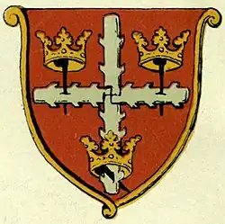 This shield, which can be blazoned as Gules, two staves raguly and couped argent, one in pale, surmounted by another in fess between two ducal coronets in chief Or the bottom part of the shaft enfiled with a ducal coronet of the last[3] or alternatively Gules two silver ragged staves joined in the form of a cross, its arms and foot pierced by Passion Nails; and three golden crowns, the bottom encircling the foot of the cross[5] was in use until 1915. It had been in use since at least 1558,[6] where it was mentioned in the heralds' visitation of that year.[6] It is thought to have been created by heralds wishing to remove the reference to a revered relic during the Reformation.[7]