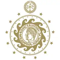 The larger coat of arms has two supporters, Stevan Sinđelić (leader of first Serbian Uprising) and Constantine the Great (Roman emperor born in Niš) holding two flags, Serbian flag with cross and four stylised letters "S" (same flag is used by Serbian Orthodox Church) and purple flag with laurel wreath and two-headed eagle. Underneath them is compartment represented by plains and motto with name of the city in Serbian, Greek and Latin representing history of the city. In the middle there is an escutcheon painted in Serbian colors (red, blue and white). In the centre of the shield there is Niš Fortress, standing beyond Nišava river. Above the fortress there is Serbian eagle similar to those on the flag held by Constantine the Great. Crest is shown as a stone crown, and over it there is a Chi Rho with Greek letters alpha and omega on the sides.[1]