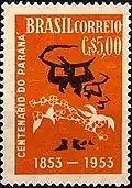 - A commemorative stamp was issued in Brazil to mark the 50th anniversary of Japanese immigration. It depicts rice and coffee trees above and below agricultural implements. (1958)
