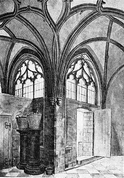 When Archbishop Walram died in 1349, the situation became even more precarious, but the following years saw the charterhouse grow in prestige and thus attract an increasing number of affluent novices, which made it wealthier, but also over-burdened the available residential space and the small chapel. Gifts and endowments for the building of a new church are recorded from 1354, and in the same year Charles IV exempted the charterhouse from payment of duty on building materials, which seems to point to construction beginning around this time.[7] The legacy of Canon Johannes of Brandenburg, who in 1365 left the monks an adjoining plot of land, provided the space for a new chapter house and library as well as the continued expansion of the church.