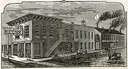 Before starting the company, the Peters brothers had worked in the leather trade,[3] but had developed a process to produce cheap buggies for close to $150 apiece, using wood obtained from a company near the Ohio Penitentiary and building using a specialized manufacturing system. Before 1870 they produced 100 and sold them successfully at auction, though their business partners refused further work, leaving them in debt.[4][Note 1] In 1870, they were introduced to Firestone, a native of Canton, Ohio and who had operated a railroad business in Cedar Rapids, Iowa, moved to Columbus and financed the business with $5,000. Their first venture, Iron Buggy Company, launched in 1870 in a shanty built for $100,[4] at 180 North High Street and focused it on selling cheap buggies.[6][7] The business saw immediate success thanks to a design created by the Peters brothers and a system of labor that made production efficient, and it sold 237 buggies in its first year.[8] The building it was housed in burnt down on May 27, 1874, and was rebuilt.[9] In 1875 its owners sold the business to another buggy producer, H. K. Tuller of Buckeye Buggy Company.[4][8]
