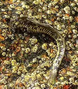 The common mudskipper (Periophthalmus kalolo) is a species of mudskipper native to marine and brackish waters of the Indo-Pacific from eastern Africa to Samoa. This species can be found in mangrove forests where it spends most of its time out of the water. This species can reach a length of 14.1 centimetres (5.6 in) SL.[1] The common mudskipper can deal with the chronic temperatures of up to 37°C and a chronic low of 14°C.[2] Larger individuals aggregate in exposed intertidal mudflats and tend to spend about 90% of their lifetime out of the water.