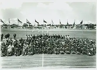 The 1930 British Empire Games were the first of what later became known as the Commonwealth Games, and was held in Hamilton, Ontario, Canada from 16 to 23 August 1930 and opened by Lord Willingdon.[19] Eleven countries: Australia, Bermuda, British Guyana, Canada, England, Northern Ireland, Newfoundland, New Zealand, Scotland, South Africa and Wales, sent a total of 400 athletes to compete in athletics, boxing, lawn bowls, rowing, swimming and diving and wrestling. The opening and closing ceremonies as well as athletics took place at Civic Stadium.[20] The cost of the Games were $97,973.[20] Women competed in only the aquatic events.[21] Canadian triple jumper Gordon Smallacombe won the first ever gold medal in the history of the Games.[22]