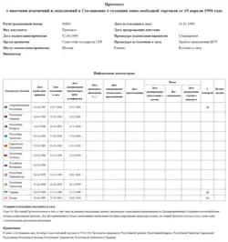 Agreement on the Establishment of a Free Trade Area (Russian: Соглашение о создании зоны свободной торговли), Protocol on Amendments and Additions to the Agreement on the Establishment of a Free Trade Area of 15 April 1994 (Russian: Протокол о внесении изменений и дополнений в Соглашение о создании зоны свободной торговли от 15 апреля 1994 года) | |