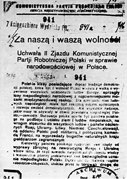 The interwar Communist Party of Poland (Polish: Komunistyczna Partia Polski, KPP) was a communist party active in Poland during the Second Polish Republic. It resulted from a December 1918 merger of the Social Democracy of the Kingdom of Poland and Lithuania (SDKPiL) and the Polish Socialist Party – Left (PPS – Left) into the Communist Workers' Party of Poland (Komunistyczna Partia Robotnicza Polski, KPRP).[1] The communists were a small force in Polish politics.[2]
