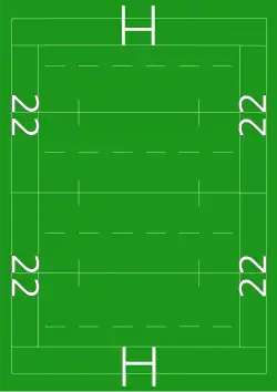 Additional lines differ markedly with Canadian football fields marked at every 5 yard interval, whereas rugby union fields only have two further solid lines called the 22 metre lines and four broken lines each halving a half (resulting in four quarters and being translated as "quarter lines" in some languages). The dotted lines are made of two 10 metre lines on each side of the halfway line and two 5 metre lines before each goal line. Rugby union fields also have another set of dotted 5 metre lines.