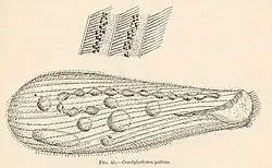 Condylostoma are very large elongated unicellular ciliates with lengths ranging from 176 to 1600 μm.[4][5] They also tend to be about 7 times longer than their width.[4][6] While the shape of the cell can vary depending on many factors, especially the amount and size of food vacuoles present, they are normally more rounded towards the middle of the cell and have a blunt posterior end. The relatively small buccal groove is about 1⁄3 the size of total body length and is present ventrally on the anterior part of the cell. The buccal groove is triangular. While there are no cilia inside the groove the surrounding "lips" are covered in cilia. Early papers describe a thin transparent undulating membrane around the buccal groove which is now known to be the adoral zone of membranes (AZM). These membranes can be composed of 70 to 200 polykinetids.[7] They have a very elastic thin pellicula (membrane) surrounding the cell which can be 2 to 8 μm depending on the section. The cells are covered in longitudinal myonemes, which help make them contractile, and have trichocysts present in the posterior end of the cells. Being ciliates they are covered in cilia except in the buccal funnel.[4] The cilia are oriented following the myonemes in rows. While the number of kinetosomes do not change during interphase, the length of the kineties do, to accommodate for the cell's change in size.[7] Their cilia are long and slender, with the posterior cilia being the longest. Additionally, some research states that the ventral side of the cell has fewer, longer cilia than the dorsal end but this has been disputed.[1][4] Additionally many species were found to have at least one frontal cirrus with some having up to four present.[8] Looking at the interior of the cell, they are full of food vacuoles as well as cortical granules. They have a macronucleus with differing numbers of nodules ranging from 6 to 120.[1][4] The pellicle of the cells is rough and dark grey, with randomly dispersed granules directly below it. The cell itself is almost colorless but has a slightly grey or yellow tinge to it.[3] No contractile vacuole was observed at least in the marine species. The cells in this genus are notoriously hard to identify for two main reasons. First, there are many morphological differences between the species in this genus making it hard to identify them as belonging to the Condylostoma genus. Second, the species that have been described do not have as much detail as would be needed given the fact that there are few character states, otherwise known as traits, that can be used to identify cells as belonging to this genus.[4]