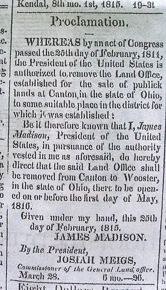 Section 4 of the Land Act of May 18, 1796 provided that the lands between the Seven Ranges and the Western Reserve be sold at “Pittsburg“. The Land Act of May 10, 1800[12] established the Steubenville Federal Land Office for sale of these lands. The Act of March 3, 1807[13] established a land office for the Congress Lands North of Old Seven Ranges that ended up in Canton, creating the Canton Land District. The Act of February 25, 1811[14] moved the office to Wooster but kept the name Canton Land District. Sales were also conducted from the nation's capital at the United States General Land Office. Local offices were eventually closed. The State of Ohio also eventually sold lands granted to them by the federal government, such as section 16 of each township.