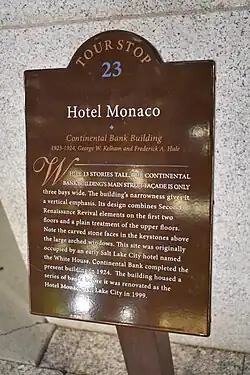 - ^ "Kimpton's Hotel Monaco Salt Lake City Celebrates Vibrant Renewal". Visit Salt Lake. September 19, 2012. Archived from the original on May 21, 2019. Retrieved May 21, 2019.