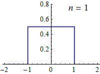 Suppose {Xi} is an iid sequence of uniform U(−1, 1) random variables. Let be their (normalized) sums. Then according to the central limit theorem, the distribution of Zn approaches the normal N(0, 1/3) distribution. This convergence is shown in the picture: as n grows larger, the shape of the probability density function gets closer and closer to the Gaussian curve. ![]() |