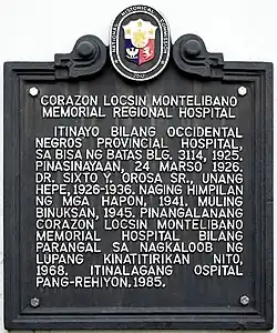 The Corazon Locsin Montelibano Memorial Regional Hospital (CLMMRH) formerly called the Occidental Negros Provincial Hospital (ONPH), was founded on March 24, 1926 with a 25-bed capacity. It is located at Lacson-Burgos Street, Bacolod City, Negros Occidental, Philippines. Its first Chief of Hospital was Dr. Sixto Y. Orosa, Sr who authored the landmark Philippine Provincial Act. In 1937, the bed capacity was increased to 100.