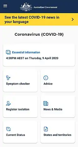 Coronavirus Australia was an app released by the Australian Government designed to allow users to access information about the COVID-19 pandemic in Australia.[2] The app was released by the Department of Health on 29 March 2020,[3] and decommissioned two years later on 31 August 2022.[4] Over its lifetime, the app was downloaded over a million times and was initially ranked first in the Apple App Store's "Health and Fitness" category.[5] Due to the short development period of two weeks, the app initially served primarily as an aggregate of links to official government websites.[6] Shortly after an update was released adding a voluntary "isolation registration" form that collected the location, name, age, mobile phone number, isolation start date, and various other details about users who were self isolating.[7][8]