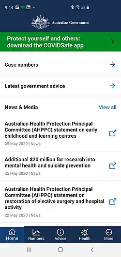 - ^ "Coronavirus Australia app". Australian Government Department of Health and Aged Care. 26 August 2022. Retrieved 26 August 2022.