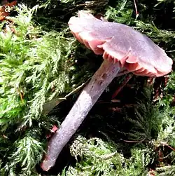 Cortinarius section Bicolores contains species that produce similar but much larger mushrooms. C. britannicus can be distinguished from other members of the subgenus by its combination of small-sized, purplish-coloured mushrooms and almond-shaped, medium-sized spores.[1]
