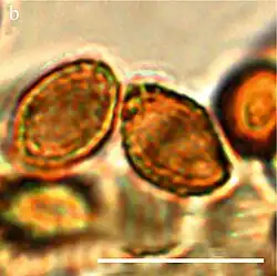 The almond-shaped basidiospores measure 8 to 9 by 5 to micrometres (μm), averaging 8.6 by 5.6 μm. The spores have a depression above the hilum, and are moderately warty, especially at the apex. The spores are moderately to strongly dextrinoid, meaning that they stain reddish to reddish-brown when Melzer's reagent or Lugol's solution is applied. The basidia are 26 to 35 by 7 to 10 μm. They are roughly club-shaped, sporting four sterigmata. The flesh in the gills is made up of rusty-brown hyphae. They are moderately covered with spot-like encrustations. The pileipellis surface is pale, consisting of more or less parallel hyphae that are 5 to 13 μm wide with zebra-like incrustations. Lower hyphae are rusty brown, 25 to 30 μm wide, with abundant zebra-like incrustations.[1]