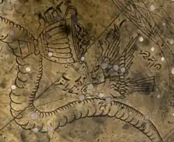 In the Babylonian star catalogues dating from at least 1100 BCE, what later became known as Corvus was called the Raven (MUL.UGA.MUSHEN). As with more familiar Classical astronomy, it was placed sitting on the tail of the Serpent (Greek Hydra). The Babylonian constellation was sacred to Adad, the god of rain and storm; in the second Millennium BCE it would have risen just before the autumnal rainy season. John H. Rogers observed that Hydra signified Ningishzida, the god of the underworld in the Babylonian compendium MUL.APIN. He proposed that Corvus and Crater (along with Hydra) were death symbols and marked the gate to the underworld.[1] These two constellations, along with the eagle Aquila and the fish Piscis Austrinus, were introduced to the Greeks around 500 BCE; they marked the winter and summer solstices respectively. Furthermore, Hydra had been a landmark as it had straddled the celestial equator in antiquity.[2] Corvus and Crater also featured in the iconography of Mithraism, which is thought to have been of middle-eastern origin before spreading into Ancient Greece and Rome.[3]