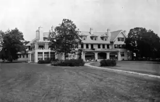 The iron gates on King Street were made by the Canada Foundry Company and cost several thousand dollars. Landscape architect for the project was Frederick Todd of Montreal. The gates opened onto a Telford road lined with large maples. Other paths on the property were of the Macadam type on ten inches of crushed stone.[6] The formal garden on the property was laid out in a double Maltese cross pattern bordered by perennials. The bulk of perennials were roses provided by Sam McGredy of Portadown, County Armagh. Among the roses found on the estate were King George V, Mrs Maynard Sinton, Mrs Muir MacKenna, Général Jacqueminot, Madame Abel Chatenay, Étoile de France, Mrs Wallace H. Rowe, Kaiserin Auguste Viktoria, Mrs John Laing, Liberty, and Frau Karl Druschki. The property included three outbuildings: a combined stable and garage, a poultry house, and a tool shed. Today, the garage and poultry house are the only surviving parts of the estate. A clay tennis court was built on what was formerly the upper part of the vegetable garden. This court was enclosed by a cedar hedge surrounded by lilacs, high bush cranberries, and bush honeysuckles.[7]