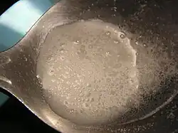 Crack cocaine is frequently purchased already in rock form,[11] although it is not uncommon for some users to "wash up" or "cook" powder cocaine into crack themselves. This process is frequently done with baking soda (sodium bicarbonate), water, and a spoon. Once mixed and heated, the bicarbonate reacts with the hydrochloride of the powder cocaine, forming free base cocaine and carbonic acid (H2CO3) in a reversible acid-base reaction. The heating accelerates the degradation of carbonic acid into carbon dioxide (CO2) and water. Loss of CO2 prevents the reaction from reversing back to cocaine hydrochloride. Free base cocaine separates as an oily layer, floating on the top of the now leftover aqueous phase. It is at this point that the oil is picked up rapidly, usually with a pin or long thin object. This pulls the oil up and spins it, allowing air to set and dry the oil, and allows the maker to roll the oil into the rock-like shape.