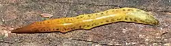 Cratera aureomaculata is a medium-sized land planarian with an elongate body with parallel margins and slightly convex dorsal surface. It reaches about 50 mm (2.0 in) in length. The dorsum has a yellow background that is covered by brown pigmentation in the anterior region. There are blackish pigmentation forming irregular flecks over the dorsal surface, being larger laterally and becoming more concentrates towards the posterior tip. The venter is light grey with yellowish margins, becoming brownish with darker margins in the anterior region.[1]