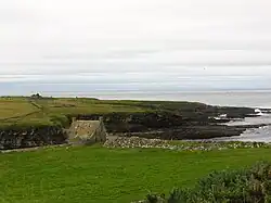 The promontory fort predated the broch, which was built inside the older structure.[5] The earlier structure was an outwork that began at the edge of the promontory in the east, a 15 feet (4.6 m) thick wall or rampart of rock with an earth core. A gateway that widened towards the outside provided access through the wall. To the west of the gateway the rampart included a structure like a cell, and then there was a recess in the inner face of the wall. The outwork continued west, ending in a fence made of flagstones that reached to the cliff edge at Chapel Geo.[6]
