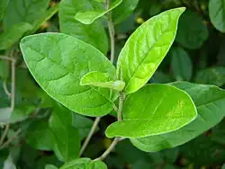 Leaves are clustered at branch tips and lack stipules. The petiole is 0.6–2 cm. Glands are absent at its apex. Leaf blades are elliptic, ovate, or oblong and measure 3–10 × 1.5–5 cm. Blade margins are typically entire, sometimes undulate. The base is rounded to obtuse, while the apex is acute, rounded, or emarginate. Abaxial surfaces are silvery or coppery and densely lepidote, while adaxial surfaces are green and sparsely lepidote.[2] When crushed, leaves emit a fragrance similar to a mixture of banana and apple.[7]