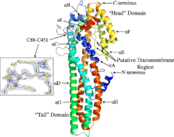 Cry6Aa proteins are unrelated to other insecticidal crystal proteins in primary amino acid structure; it is a member of the Tripartite Haemolysin BL family (TCDB). The protein is rod-shaped, with a diameter of 25 Å and height of 95 Å. It contains 475 residues, not including the N-terminal tail.[5] Most Cry proteins have 3 main domains with functional homology across proteins, domain I contains an alpha helix bundle, domain II is composed of three antiparallel beta sheets in a Greek key motif, and domain III forms a beta sandwich responsible for catalyzing pore formation.[6] However, Cry6Aa, a nine turn protein, consists of bipartite head and tail domains composed mainly of alpha helices. Secondary structure conformation is 71-72% alpha helices and 1-2% beta sheets in most pH conditions. The remaining regions are either bends, turns, or 3/10 helices.[7] The trypsin resistant core is composed of long amphipathic alpha helices and fuels toxic function. The hydrophobic regions of the helices interact with each other, while the hydrophilic portions have increased exposure to the outside environment. Some of the helices are interrupted by loops that have variable positions in the structure. The head domain folds over the helices and contains a beta tongue group, which may trigger pore formation. There is a strong disulfide bond between the C terminal region and a portion of the core that isn't disrupted by trypsin. The protein has structural similarities to other toxins, including haemolysin E and B. cereus toxins HlbB and NheA.[8] No other members of the Cry family utilizing alpha pore toxin structure have been discovered.