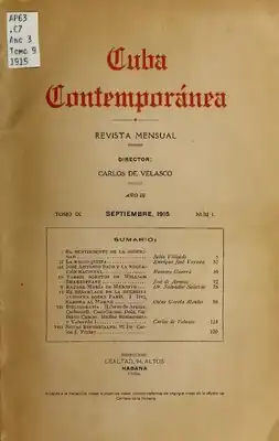 Cuba Contemporánea was a Cuban magazine published monthly in Havana from January 1913 to August 1927, and has been described as "the first great magazine of Cuban thought in the 20th century,"[1][2] achieving significant international prestige despite facing censorship and opposition within the island. It was founded and written by prominent members of the "first generation of the Cuban Republic" – a group of independent and liberal intellectuals who emerged following Cuba's independence in 1902.[1] The magazine sought to emulate earlier publications such as Revista de Cuba and Revista Cubana.[1] The magazine's mission was to provide an open platform for modern thought, particularly encouraging Cuban literary and intellectual production, bibliographic studies, and historical analysis – especially regarding Cuba, the Spanish-speaking world, and the broader Americas.[1] Antonio Checa Godoy described it as the most significant and enduring publication of its time.[1] Each issue varied in length, typically between 100 and 200 pages, and every four issues formed a volume, complete with indexes of topics and authors.[1] The full collection comprised 44 volumes, with the final issue published between June and August 1927.[1][3]