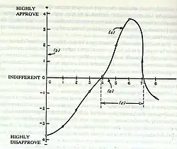 Developed in the 1960s, the return potential model provides a method for plotting and visualizing group norms. In the regular coordinate plane, the amount of behavior exhibited is plotted on the X-axis (label a in Figure 1) while the amount of group acceptance or approval gets plotted on the Y-axis (b in Figure 1).[45] The graph represents the potential return or positive outcome to an individual for a given behavioral norm. Theoretically, one could plot a point for each increment of behavior how much the group likes or dislikes that action. For example, it may be the case that among first-year graduate students, strong social norms exist around how many daily cups of coffee a student drinks. If the return curve in Figure 1 correctly displays the example social norm, we can see that if someone drinks 0 cups of coffee a day, the group strongly disapproves. The group disapproves of the behavior of any member who drinks fewer than four cups of coffee a day; the group disapproves of drinking more than seven cups, shown by the approval curve dipping back below zero. As seen in this example, the return potential model displays how much group approval one can expect for each increment of behavior.