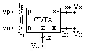 where and is the external impedance connected to z terminal of the CDTA. CDTA can be thought as a combination of a current differencing unit followed by a dual-output operational transconductance amplifier, DO-OTA. Ideally, the OTA is assumed as an ideal voltage-controlled current source and can be described by , where Ix is output current, and denote non-inverting and inverting input voltage of the OTA, respectively. Note that gm is a function of the bias current. When this element is used in CDTA, one of its input terminals is grounded (e.g., ). With dual output availability, condition is assumed.