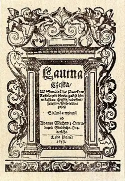 The Czech Lute (in modern Czech orthography: Loutna česká; the full original title Lautna Cžeská, W Swátek, w Pátek, w Kostele, při Stole, jak se líbi, w každau chwíli, radostně, žalostně, spasytedlně znící) is a classical piece written by the Czech composer, Adam Michna z Otradovic. It is one of the early examples of the Czech Baroque music, originating from the seventeenth century (more precisely, from 1653). The whole piece is made up of 13 parts describing specific stories.[1] The first one is called "Foreword" and it is about a marriage between a man and a woman. The following texts talk about historical stories, for example the fate of Paris and Troy or the story of Jesus and Mother Mary.[2]