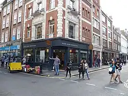 The George public house is located at the eastern end on the corner with Berwick Street. A public house has stood on the site since at least 1739. The current building was constructed in 1897.[3] No. 8 D'Arblay Street was formerly The Britannia public house owned by Watney Combe Reid.