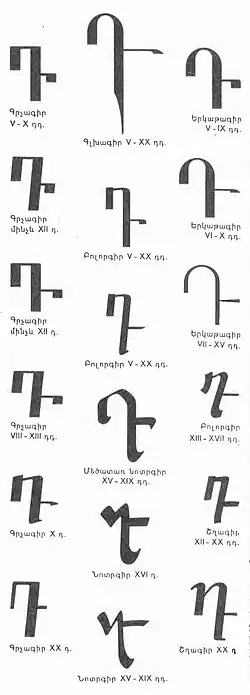 Da, Ta, or T’a (majuscule: Դ; minuscule: դ; Armenian: դա) is the fourth letter of the Armenian alphabet, representing the voiced alveolar plosive (/d/) in Eastern Armenian and the aspirated voiceless alveolar plosive (/tʰ/) in Western Armenian. It is typically romanized with the letter D.[1] It was part of the alphabet created by Mesrop Mashtots in the 5th century CE. In the Armenian numeral system, it has a value of 4.[2]