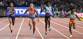 After the disappointment of Rio, Schippers decided to change. She parted with Bart Bennema as her coach, who had overseen her transition from an outstanding heptathlete, winning bronze in the World Championships Moscow 2013, into a successful 100 m and 200 m sprinter. Both felt that she had to try a different approach to progress, and so she decided to join U.S. coach and sprint guru Rana Reider[30] and focus on the 2017 World Championships in Athletics in London, to defend her world title in the 200 m. After winning the bronze in the 100 m, she won the 200 m title, joining Jamaican Merlene Ottey and USA's Allyson Felix as the only athletes to successfully defend a world title in the event.[24][31] "It's a great feeling to be world champion for the second time," she said. "I was a bit nervous beforehand, but I'm a final runner, and bring my best in finals, so I'm very grateful for the experience today. There were so many Dutch fans in the stadium, all wearing orange. To win this two times in a row is brilliant."[24] The Dutch 4 × 100 m relay team (Madiea Ghafoor, Schippers, Sedney, Samuel) finished 8th.
