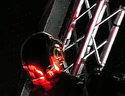 In 2001, Daft Punk began wearing robot costumes for promotional appearances and performances for Discovery, debuted in a special presentation during Cartoon Network's Toonami block.[133] The helmets were produced by Paul Hahn of Daft Arts and the French directors Alex and Martin,[134] with engineering by Tony Gardner and Alterian, Inc. They were capable of various LED effects.[135] Wigs were originally attached to both helmets, but Daft Punk removed them moments before unveiling them.[22] Bangalter said the helmets were hot but that he became used to this.[136] Later helmets were fitted with ventilators to prevent overheating.[137] The costumes were compared to the makeup of Kiss and the leather jacket worn by Iggy Pop.[136]