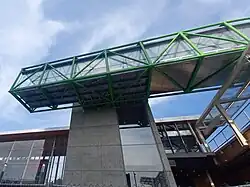 On July 9, 2018, the design for the new station was revealed. A glass-covered pedestrian bridge enables foot traffic between the inbound and outbound platforms, and provide a view of the city's skyline. The station was designed by the architecture firm Perkins and Will[35] and structural engineering firm Simpson Gumpertz & Heger.