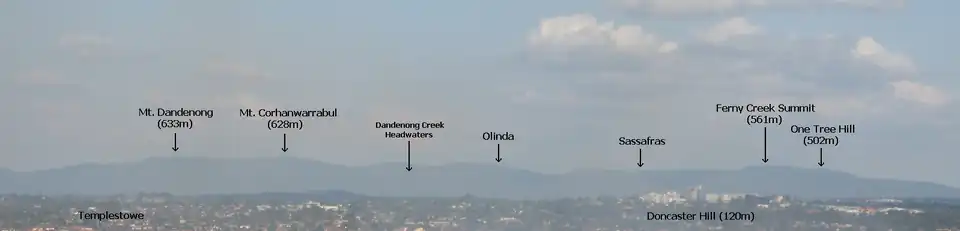 ![]() Left - Mount Dandenong and right - Mount Corhanwarrabul, viewed from Mooroolbark | |