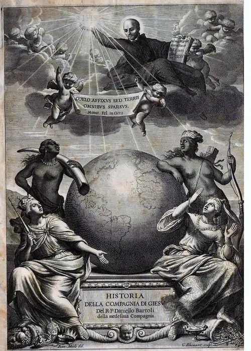 The remarkable success of Bartoli's literary debut coincided with the triumph of the High Baroque in Rome and it serves as a testament to the formative role of the Italian Jesuits as cultural entrepreneurs meditating between the sacred and the profane elements of the age. L'huomo di lettere (1645) became a cultural vademecum for the aspirations of a new generation of humanist intellectuals. Its eloquence and erudition found a lively balance between devotion to antiquity and consciousness of the modern. In Italy it was a bestseller. During the decades of Bartoli's life that followed, the work had editions and reprints nearly annually in Rome, Bologna, Florence, Milan and especially Venice. In the same period there were translations in French, German, English, Latin, Spanish and later Dutch. But history was his main task as a Jesuit man of letters. As such Bartoli represents the shift from the preceding Latin humanist historiography of Niccolò Orlandini and Francesco Sacchini to the illustrious Jesuit prose tradition he established in Italian when he undertook the official history of the first century of the Society of Jesus (1540). His monumental Istoria della Compagnia di Gesu (Rome, 1650–1673), in 6 folio vols. is the longest Italian classic. It begins with an authoritative, if somewhat ponderous, biography of the founder Ignatius Loyola.[8] Particularly fascinating and exotic are his histories of Francis Xavier and the Jesuit missions in the East which describe India and the opening of the East, L'Asia (1653) in eight books. A shorter work on Akbar the Great and Rodolfo Acquaviva came out in 1653 and was added to the third edition of L'Asia in 1667.[9] Part II of the first corner of the world he completed was Japan, Il Giappone (1660) in five books, and the Part III on China, La Cina appeared in four books (1663). To these he opened his projected Europa with the missions on the Jesuits in England, L'Inghilterra (1667) and a final work on the opening years of the order in the Italy of St. Ignatius, Diego Laynez and Francis Borgia, L'Italia (1673). With these histories he alternated treatises on language use, Del torto e del diritto del non si può[10] and moral works like La Ricreazione del savio.[11] In the 1660s the Lyons Jesuit Louis Janin, translator of L'huomo di lettere issued Latin translations of these histories. From 1671 to 1674 Bartoli served as Rector of the Collegio Romano in recognition of his international prestige as a writer. Indefatigible in his final years Bartoli produced 4 Jesuit biographies and three scientific treatises on pressure, sound, coagulation. His several works of spiritual reflection were brought together a folio edition, Le Morali in 1684. His final work, Pensieri sacri[12] went to press after his death in Rome, January 13, 1685.