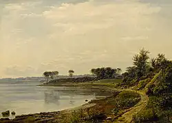 Unlike most of his contemporaries, Dreyer never went abroad to further his studies, although he applied for travel scholarships on three occasions. Instead, he travelled widely in Denmark. His native island of Funen remained a focal point for his artistic attention throughout his career, particularly the area around Assens where he had grown up. A place of particular importance to him was the small manor house of Rugaard which he visited almost every summer from 1837 to 1847 to paint.[1] Several times he also sought out the small island of Brandsø in the Little Belt, the narrow strait between Funen and Jutland, where he found a near perfect landscape to his liking with dolmens and distant coasts.