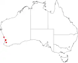 This darwinia grows among granite outcrops in the Jarrah Forest and Swan Coastal Plain bioregions of south-western Western Australia.[2]