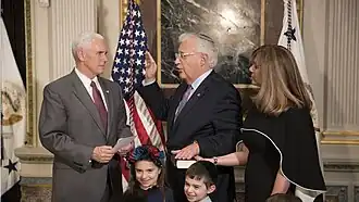 On March 29, Vice President Mike Pence officially administered the oath of office, swearing in Friedman.[54] He succeeded Leslie Tsou, who served as the interim chargé d'affaires after Daniel Shapiro left the position on January 20.[55][56]