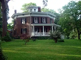 The David Van Gelder Octagon House, also known as Springside is located at 21 Walnut Street in Catskill, New York. The brick house was built in 1860. It is architecturally significant as an example of an octagon house. The eight-sided plan was made popular in the mid-19th century by phrenologist Orson Squire Fowler. He called the floor plan "a superior plan". It includes four large square rooms and four small triangular rooms on each of the two floors. Two corners of each of the triangular rooms are small triangular closets. A central stair rises through the house to the cupola on the roof. A kitchen wing was added, likely in the mid-1870s.[2]