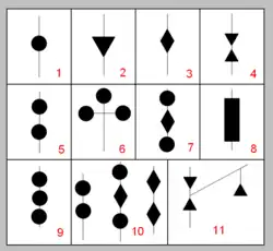 Day shapes are mast head signals visually indicating the status of a vessel to other vessels on navigable waters during daylight hours whether making-way, anchored, or aground. These signals consist of a set of simple geometric shapes—ball, cylinder, cone, and diamond—that are displayed, hung from a mast, in a prescribed manner to indicate a vessel's operational status; some of these signals may be somewhat involved.[1] The meanings of the shapes are defined by the International Regulations for Preventing Collisions at Sea (ColRegs).