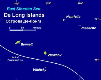 Some US individuals assert American ownership of Jeannette, Henrietta and Bennett Islands in the De Long group.[10][11] This assertion is not supported by the US government.[11][12] Following their discovery in 1881, De Long claimed these islands for the U.S.[13] and reported to the United States Department of the Navy that a party had landed on Henrietta Island and taken possession.[14] During 1916 the Russian ambassador in London issued an official notice to the effect that the Imperial government considered these islands were integral parts of the Russian Empire. This territorial claim was later maintained by the Soviet Union. A resolution of the Alaska State Senate in 1988 supported an American claim to the islands, but during 1994 the Alaska State Supreme Court ruled in D. Denardo v. State of Alaska that Bennett Island, along with several other islands, is not part of Alaska.[15] The United States Department of State has asserted that claim has never been made by the United States to any of the islands, and the US recognizes it as Russian territory.[12]