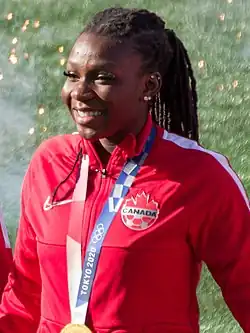 In August 2016, she helped Canada win their second Olympic bronze medal after scoring the game-opening goal during the third-place match against Brazil, in which Canada won 2–1.[4] Moreover, she became the youngest female Olympic goalscorer, aged 17 years and 169 days.[20] On May 25, 2019, she was named to the roster for the 2019 FIFA Women's World Cup.[21]