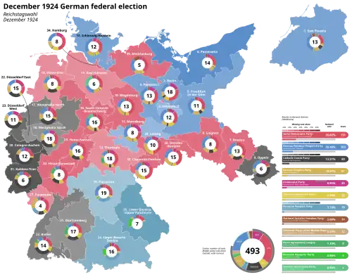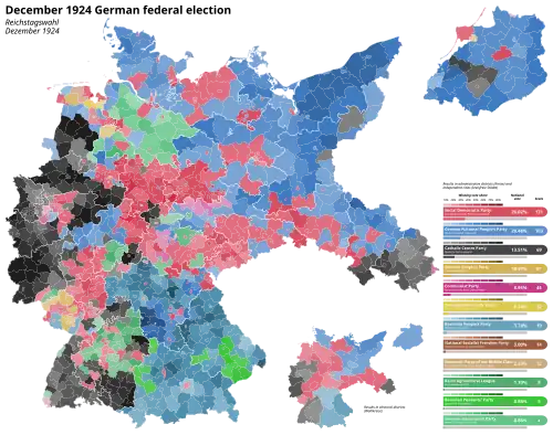 A federal election for the third Reichstag of the Weimar Republic was held in Germany on 7 December 1924.[1] The parties of the far left and far right suffered significant losses in the voting, while the moderate left Social Democratic Party (SPD) made the greatest gains and remained the strongest party in the Reichstag. The negotiations for a ruling coalition nevertheless led to a shift to the right. The new government of the independent Hans Luther, a five-party centre-right coalition without the SPD, included the monarchist German National People's Party (DNVP) for the first time.
