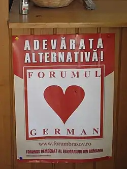 The Democratic Forum of Germans in Romania (German: Demokratisches Forum der Deutschen in Rumänien, DFDR; Romanian: Forumul Democrat al Germanilor din România, FDGR; in short Forumul German or Das Forum) is a political party (legally recognized as an association of public utility according to the governmental decision HG 599 as per 4 June 2008) organised on ethnic criteria representing the interests of the German minority in Romania.[4][5][6]