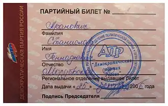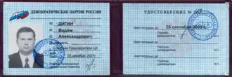 The Democratic Party of Russia (DPR)[a] is a conservative Russian political party that was founded in 1990. Under the leadership of Andrey Bogdanov, the party advocated the entry of Russia into the European Union.[1] In 2008, the party merged with several others to form the Right Cause. It was re-established as a party and officially registered again in 2012.