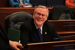 Egan joined the Republican-led Senate majority in the 28th Senate, from 2013 to 2014, earning the chairmanship of the Transportation Committee.[19] He continued to vote with Democrats on several major bills, including Governor Sean Parnell's oil tax initiative in 2013,[20] and was not invited to an organizational meeting for the majority caucus after the 2014 election. In the 29th Senate, which began in 2015, he was a member of the Democratic minority caucus.[21]