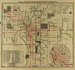 Land speculators, not served by the existing railway and believing that they needed street railway service to get better value from their real estate, launched the Denver Electric and Cable Railway Company in 1885. Incorporated for fifty years, this service was to run on electricity or by cable. Fearing these new methods would prove unprofitable, the Denver Electric and Cable Railway Company, petitioned for and were given the right to use horse-power, despite the Denver City Railway Company's exclusive horse railroad franchise.[2] Some of the initial investors then spun off a new company, The Denver Railway Association, which was given the rights to horse railways. This move was very unpopular with both the Denver City Railway Company and the remaining investors in the Denver Electric and Cable Railway Company. Thus the Denver Railway Association was reincorporated and the newly consolidated company renamed the Denver Tramway.[2]