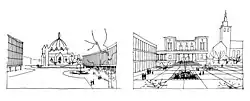 Early concept design sketches by the architect Erling Viksjø, exploring the relationships between existing and proposed new buildings